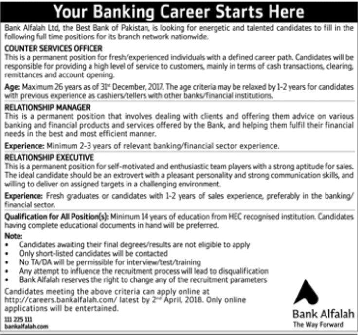 Bank Alfalah Ltd Jobs 2018