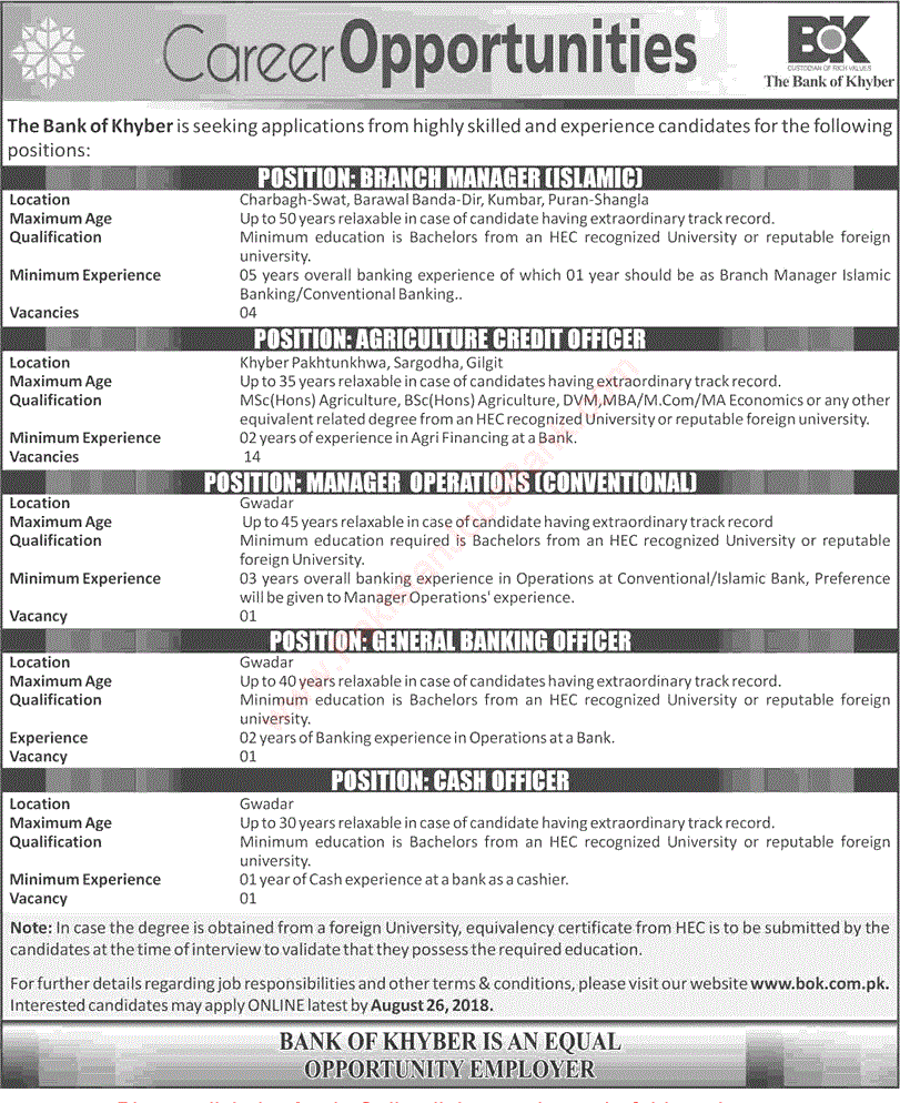 The Bank of Khyber is a provincial government bank owned by Government of Khyber Pakhtunkhwa and based in Peshawar, Pakistan, with 130 branches all over the country. It was set up as a state-owned, regional bank in 1991 along with the Bank of Punjab and the First Women Bank. They are invited the Qualified Staff Those Candidates who Fulfill The Required Qualification, Age Experience and All other Requirements which are Published in Jobs Advertisement they can Apply For Following Vacant Positions: