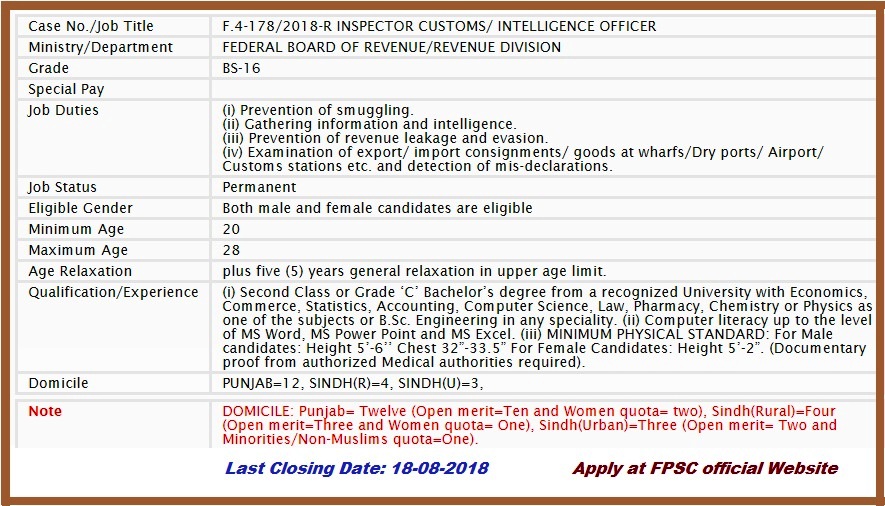 - Inspector Custom / Intelligence Officer Bs-16 (Vacancies 19)