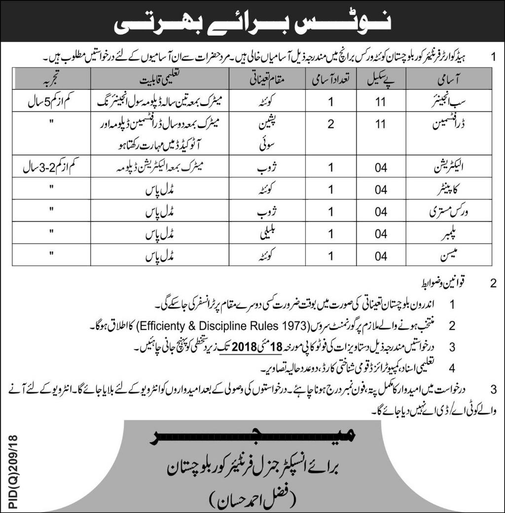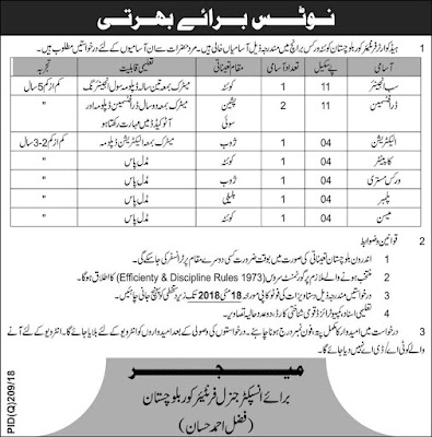 Frontier Corpse FC Balochistan Jobs 2018 for Technical Staff