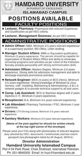 Hamdard University has announced the 45 vacancies for Lecturer, Admin Officer, Manager Student Affairs, Admission Officer, Network Engineer, Computer Lab Assistant, Receptionist, Lab Attendant, Driver, Sanitary Worker. This ad is published in Jang on Monday 22 July 2019. Last Date is Friday 02 August 2019.