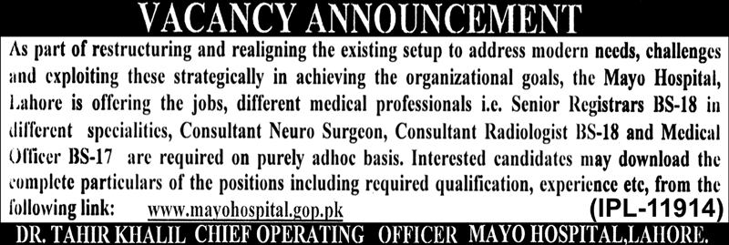 Mayo Hospital is a Government Hospital, it is located in Lahore, Punjab Pakistan. As Part of restructuring and realigning the existing setup to address needs, challenges and exploiting these strategies in achieving the organizational goals the Mayo Hospital Lahore, is offering the jobs, different medical professionals, Senior Registrar BS-18, in different specialties, Consultant Neuro Surgeon, Consultant Radiologist BS-18, and Medical Officer BS-17, are required on purely adhoc basis, Interested candidates may download the complete Particulars of the positions including required qualification, experience etc by Visiting the Mayo Hospital Official Website www.mayohospital.gop.pk