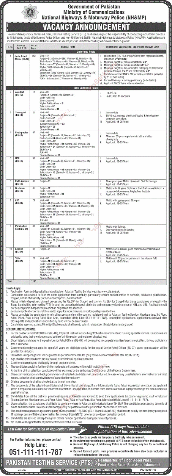 To ensure transparency. fairness & Merit, Pakistan Testing Service (PTS) has been assigned the responsibility of conducting recruitment process to fill the 1158 Vacancies of Uniformed Police Officer and non-Uniformed staff in National Highways & Motorway Police (NH&MP). Interested Candidates invited from the overall Pakistan.