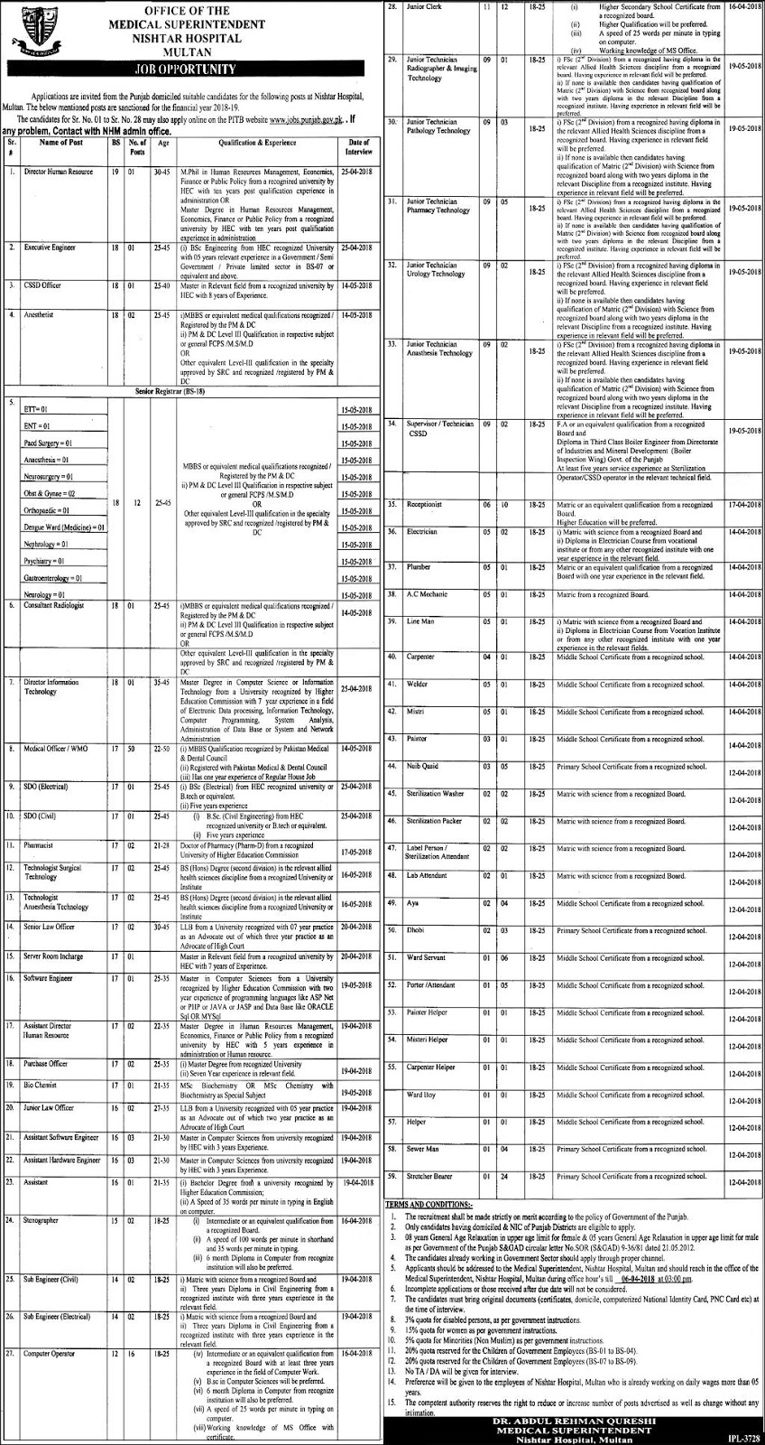 Nishtar Hospital Multan Jobs 2018 for 226+ Vacant Position of Computer Operator, Junior Clerk, Receptionist & Others , Latest Govt Jobs