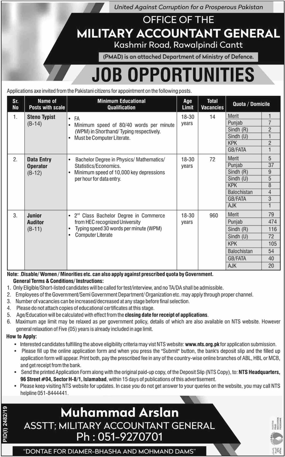 Pakistan Military Accounts Department PMAD has Published in November 2019 NTS Advertisement (Positions 1046) For Stenotypist, Junior Auditor and Others . Eligible candidates (Males/Females) can apply via National Testing Services NTS. This Advertisement has been published in Express News Paper in November 2019. The Details of Vacant Positions & Qualification in Pakistan Military Accounts are following: