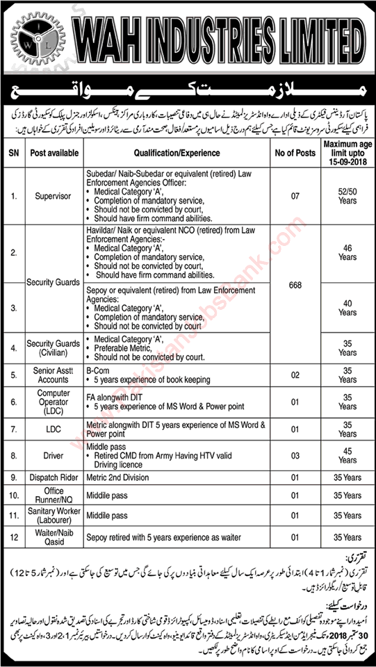 The Pakistan Ordnance Factories is a major firearms, defence contractor, and military corporation headquartered in Wah Cantt, Punjab, Pakistan. It is “the largest defence industrial complex under the Ministry of Defence Production, producing conventional arms & ammo to international standards. They are invited the Qualified Staff Those Candidates who Fulfill The Required Qualification, Age Experience and All other Requirements which are Published in Jobs Advertisement they can Apply For Following Vacant Positions: