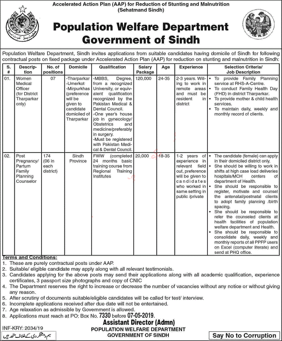 Population Welfare Department Sindh Jobs April 2019 For Family Planning Counselors & Women Medical Officers Latest April 2019 Advertisement.