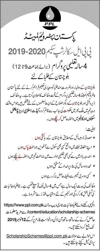 Pakistan Petroleum Limited PPL has announced the scholarships from class 9th to 12th class ( 4 years ) for talented & eligible students of Balochistan Domicile holders. Its only for those students who are enrolled in 9th class in any Cadet / Military / Residential / Schools & Colleges.