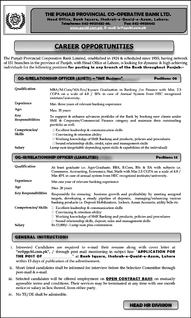 Punjab Provincial Cooperative Bank Limited Jobs 2018