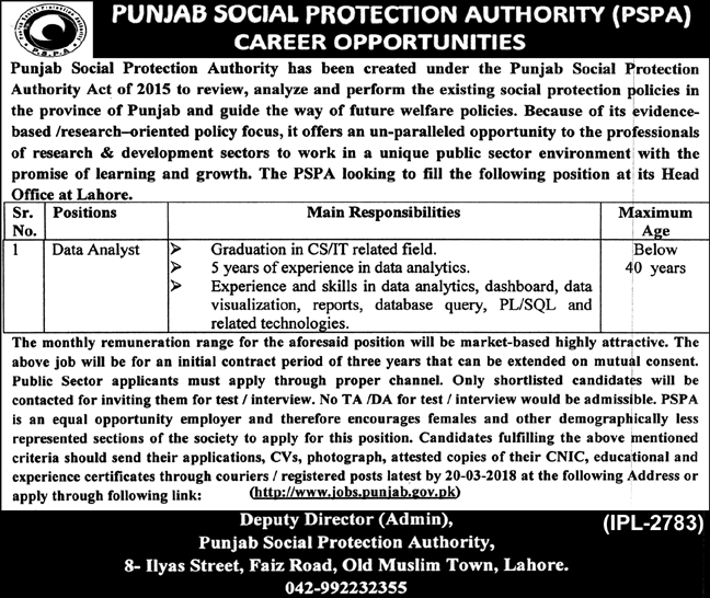 Punjab Social Protection Authority (PSPA) Jobs 2018
