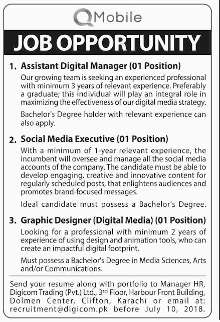 - Q Mobile Jobs in Karachi June 201801 Assistant Digital Manager