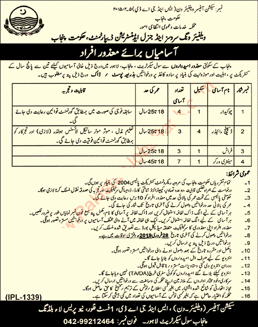 Services and General Administration Department Punjab has Announced the Latest Vacancies 17 for Disable candidates. They are invited the Qualified Staff Those Candidates who Fulfill The Required Qualification, Age Experience and All other Requirements which are Published in Jobs Advertisement they can Apply For Following Vacant Positions: