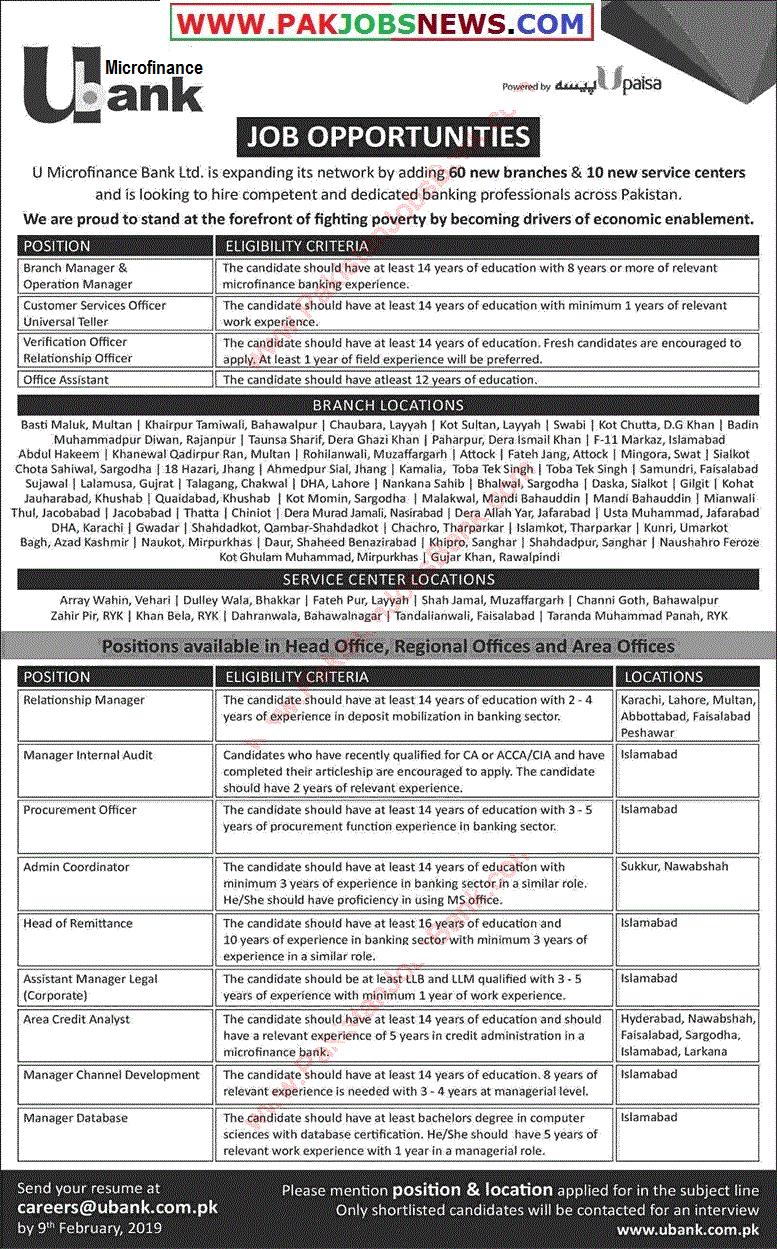 U Microfinance Bank Limited has announced 3000 Vacancies in overall Branches thise are whole in Pakistan’s different cities. They are invited the Qualified Staff Those Candidates who Fulfill The Required Qualification, Age Experience and All other Requirements which are Published in Jobs Advertisement they can Apply For Following Vacant Positions: