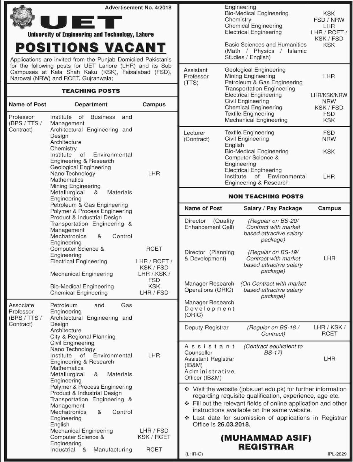 UET Lahore 200+ Lectures Jobs 2018