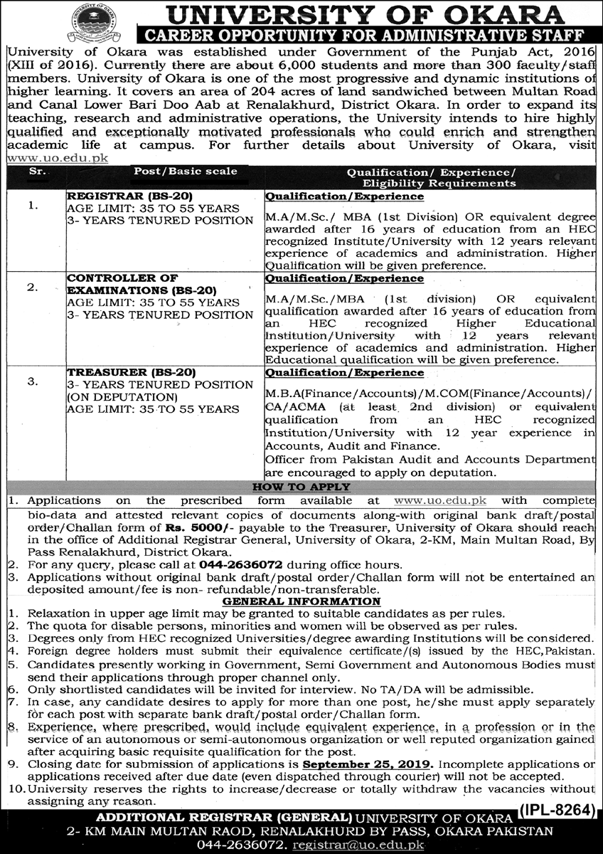 University of Okara Jobs September 2019 for Controller Of Examination, Treasurer and Others
