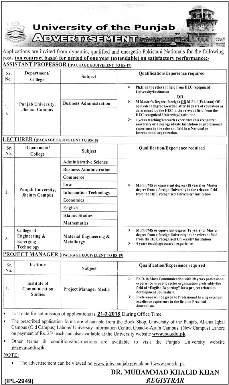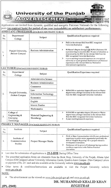 University of Punjab Lahore Jobs 2018