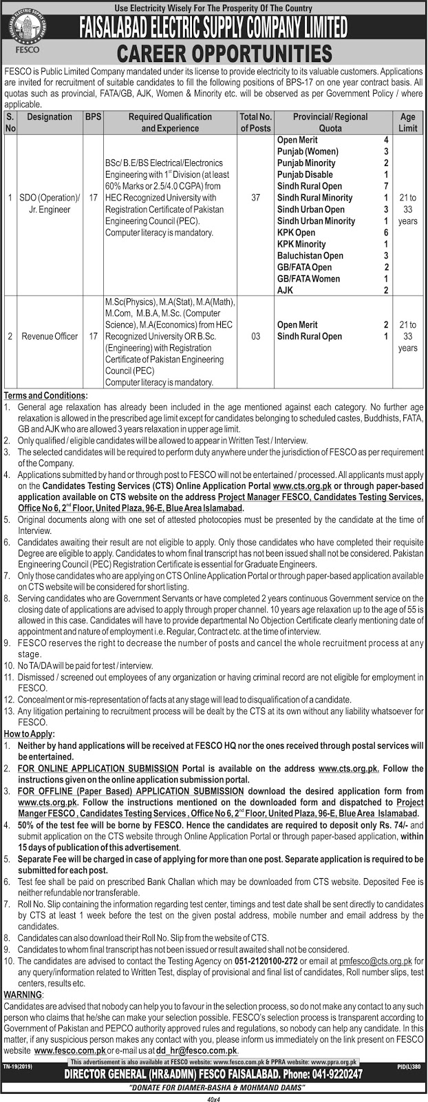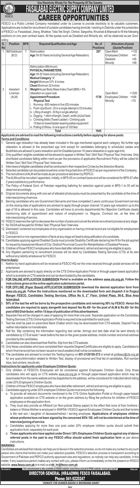 Faisalabad Electric Supply Company Limited FESCO has announced the latest 1985+ Vacancies for Revenue Officer, SDO Operation, Assistant Lineman / Bill Distributors in this Latest WAPDA – FESCO Advertisement August 2019.